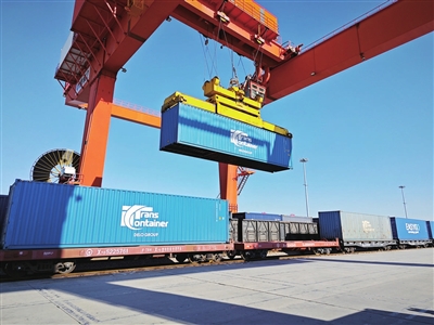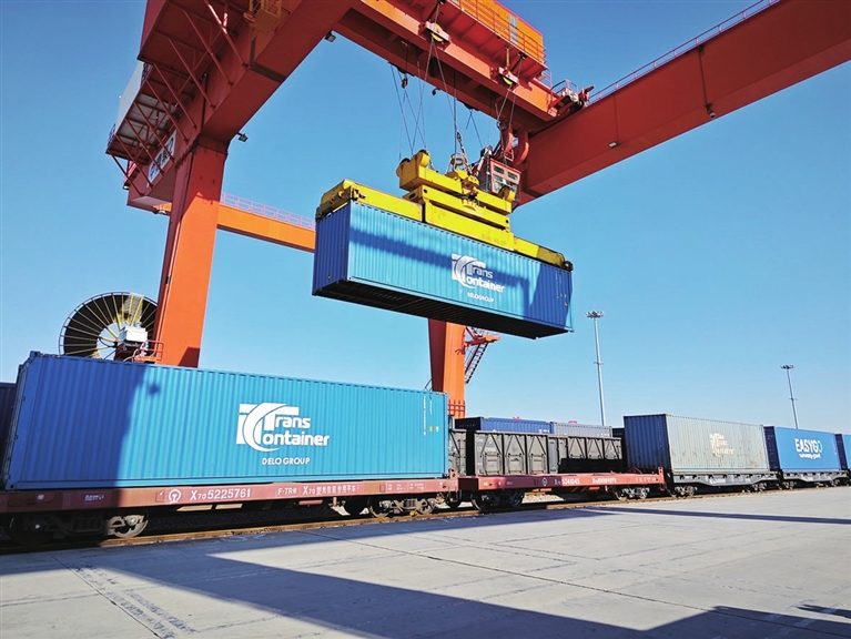 3月13日,山西转型综改示范区中鼎物流园,工作人员通过智能场站系统完成中欧班列的装卸任务。该系统主要由远程监控自动化龙门吊、集装箱无人导航车、场区管理作业调度系统三部分组成,可实现远程、无人作业,提升装车效率。牛利敏 摄