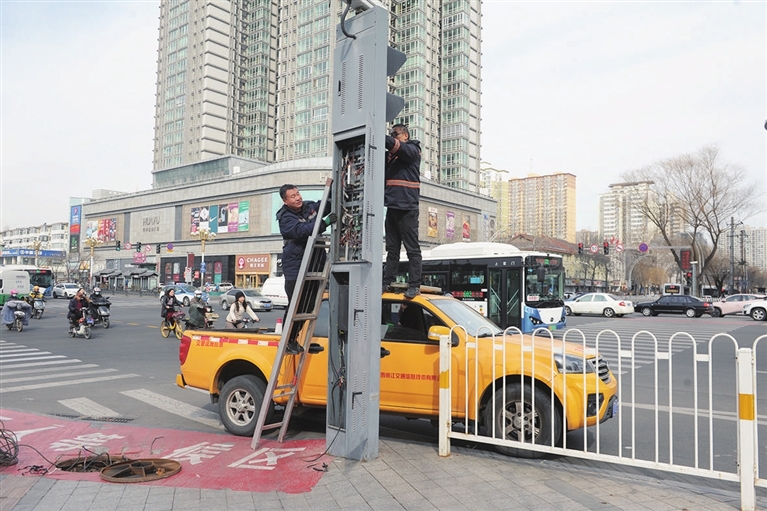 3月13日,交管部门工作人员在府西街新建路路口抢修行人交通信号灯。张澍宏 摄