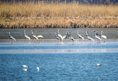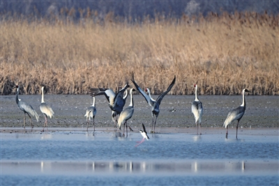 近期,随着天气转暖,天津七里海湿地自然保护区迎来了大批迁徙候鸟在这里休憩觅食。最新观测显示,东方白鹳、白枕鹤等大批迁徙候鸟已经抵达天津七里海湿地自然保护区,为春日湿地增添勃勃生机。新华社记者 孙凡越 摄