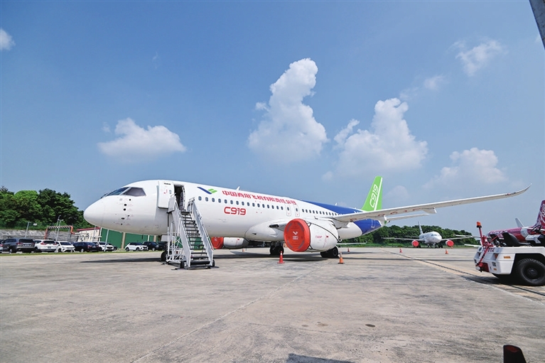 3月13日,中国国产商用飞机C919大飞机在马来西亚雪兰莪州的苏丹阿卜杜勒·阿齐兹·沙阿机场作静态展示。中国国产商用飞机ARJ21和C919日前飞抵位于马来西亚雪兰莪州的苏丹阿卜杜勒·阿齐兹·沙阿机场进行地面静态展示和演示飞行。新华社发(张纹综 摄)