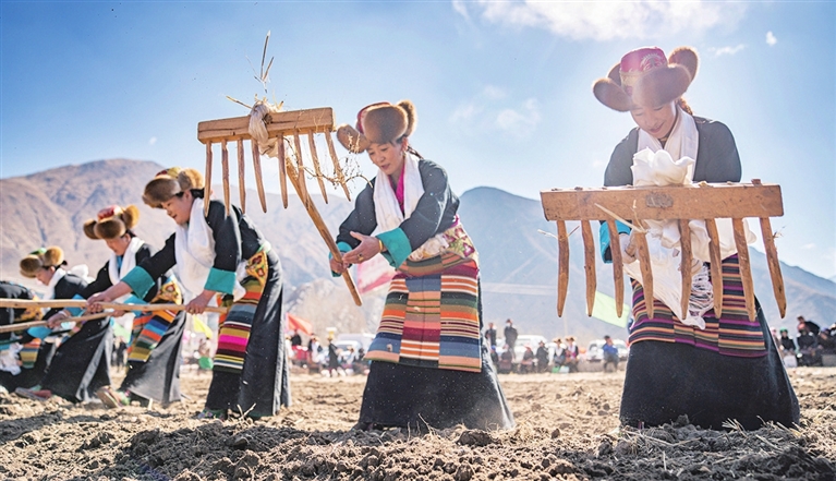 3月16日,在西藏拉萨市堆龙德庆区马镇马村的春耕仪式现场,农民平整田地。当日是西藏农民举行一年一度春耕大典的日子。村民沿袭着传承千年的春耕民俗,身着节日盛装,手捧“切玛”(五谷丰登斗),唱起祈愿歌,互敬青稞酒。当铁犁翻开土地,妇女将手中的种子撒下,祈求新的一年丰收。