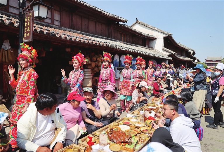3月16日,在云南省巍山县巍山古城,身着民族服装的演员在巍山小吃节牛头长街宴上欢迎游客。
