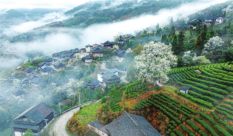 3月17日拍摄的广西三江侗族自治县八江镇归令村茶园景色(无人机照片)。春到茶乡,三江县的村寨、山花与茶园构成美丽的田园图画。新华社发 (粟勇主 摄)