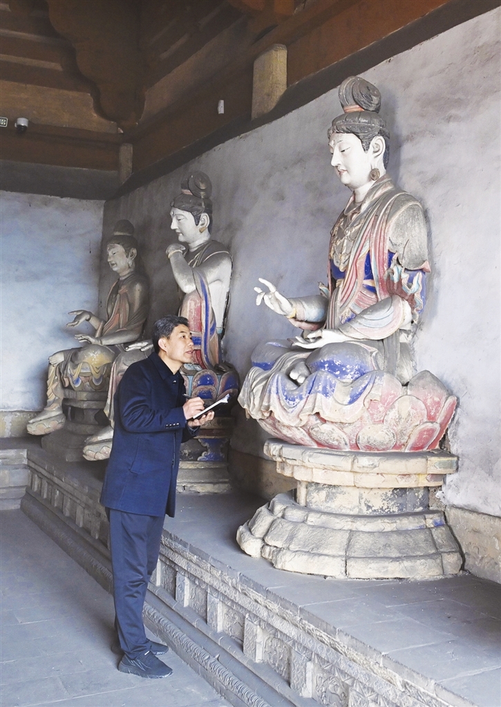 起初,张宇飞的工作只是看护寺庙、防止偷盗,偶尔客串一下讲解员。在日复一日的工作中,他开始重新审视这些被称为“国保”的塑像和建筑。面对游客提问却答不上来,张宇飞下定决心挖掘文物背后的故事,查阅史料、研读碑文、请教专家、走访乡民……