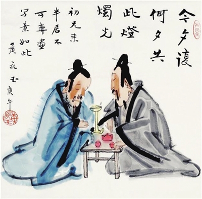 该诗首句以东西间隔的参商二星为喻,写出人生中会少离多的普遍现实和深沉无奈,也为接下来描写与卫八处士的相见酿足了情绪。一句“今夕复何夕”的感慨,将其不敢相信眼前与老友共此烛光的惊喜之情,刻画得淋漓尽致。微弱的烛光下,他们的交谈何等惬意,听闻唐军战败的悲愤,“三吏”“三别”的忧愁,个人仕途的偃蹇,似乎全被隔绝在烛光所照的界域之外了。仔细端详,朋友的双鬓已经苍白,其实也映照出他自己的老态。两人所谈无非过往,而过往共同的旧时相识已有多人离开了世间,在一声声难以置信的惊呼中,肠内渐渐涌起了灼热的痛感。呜呼哀哉!如此来看,杜甫20年后能重到卫八家中一会,是他们都未曾、也不敢预料的。天地无穷事,江湖见在身,幸甚至哉!