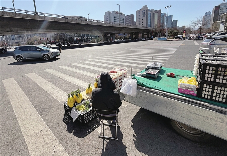 3月19日,南内环体育路口,一商贩在斑马线处摆摊,影响交通和市容。邓寅明 摄