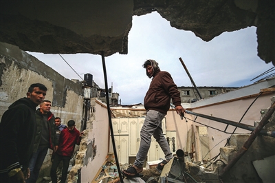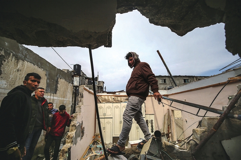 三月十九日,在加沙地带南部城市拉法,巴勒斯坦人查看被以军空袭后的建筑。新华社发(亚西尔·库迪 摄)