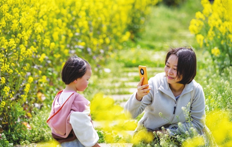 3月21日,游客在绥阳县盛林生态农场赏花拍照。春日里,在贵州省遵义市绥阳县盛林生态农场,油菜花、桃花等花卉竞相绽放,吸引游人前来赏花游玩。新华社发 (范 晖 摄)