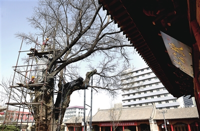 3月22日,小店区狄村社区文化园内,工作人员正在对一棵1300余年树龄的国槐展开保护性修复,通过开展除菌防腐、树洞修补、生物技术处理等保护措施,使国槐继续焕发生命力。牛利敏 摄