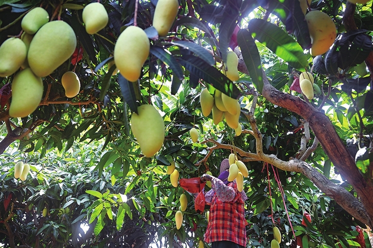 3月22日,海南省陵水黎族自治县英州镇的农民在采摘芒果。眼下是海南芒果采摘上市的高峰期,据了解,作为当地种植面积最大的热带果树,海南全省芒果种植面积约100万亩,产量超100万吨。新华社记者 郭 程 摄