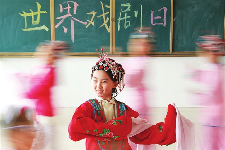 3月27日,山东省高密市崇实小学举行“茂腔文化进校园”活动,孩子们在戏曲老师的指导下练习茂腔。当日是世界戏剧日,各地举行多种活动,戏曲艺术进校园、进社区,让大众感受我国传统戏曲文化的魅力。 新华社发 (李海涛 摄)