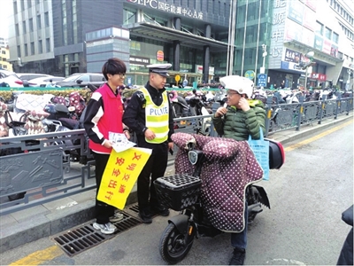 最后,同学们跟随民警来到了辖区迎泽西大街千峰路口,执勤民警对大学生志愿者们进行简短培训,并讲解了路口的流量特点、执勤时的标准动作及应注意的安全问题。大学生志愿者们走上街头,协助民警劝导纠正行人横穿马路、车辆逆行、骑乘电动自行车不佩戴安全头盔等不文明交通行为。同时向过往群众发放交通安全宣传资料,劝导驾乘人要遵守交通安全法律法规。