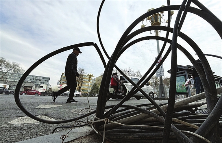 3月28日,府东街五一路口,线缆裸露在地面上,存在安全隐患。邓寅明 摄