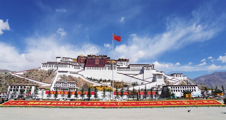 早上10点钟,拉萨各族各界2000多名干部群众身着节日盛装,齐聚布达拉宫广场。伴随着嘹亮的国歌,五星红旗冉冉升起,在蓝天白云的映衬下,显得熠熠生辉。