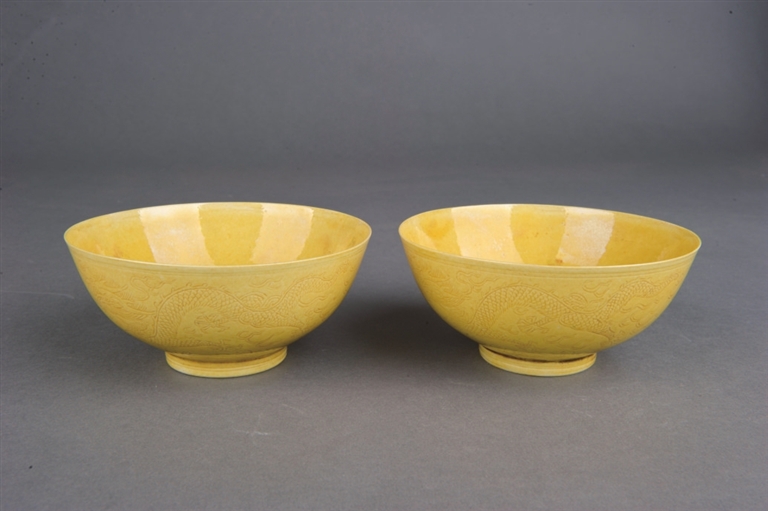 太原市博物馆馆藏瓷器中有一对清光绪款黄釉暗刻海水云龙纹碗,为国家二级文物。高5.6厘米,口径12.3厘米,足径5厘米。碗直口圆腹,外壁通体施黄釉,釉面光洁莹润,釉下暗刻云龙纹,上面团云,下面海水,龙游戏于间。底书青花“大清光绪年制”六字双行楷书款。