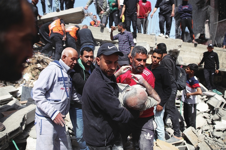 3月31日,在加沙地带中部迈加齐难民营,人们在以军空袭后开展救援。据巴勒斯坦通讯社3月31日报道,以色列军队30日晚起袭击加沙地带多个地区,造成至少28人死亡。新华社发