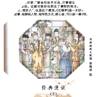 有副对联:“黄金非宝书为宝,万事皆空善不空。”挺合我的想法。这副对联好在抓住了事物的根本。“读好书,写好文,做好人”,也是这个意思。《红楼梦》是一本好书,有生动故事,有鲜活人物,有传统文化,耐心读,可以读一辈子的。