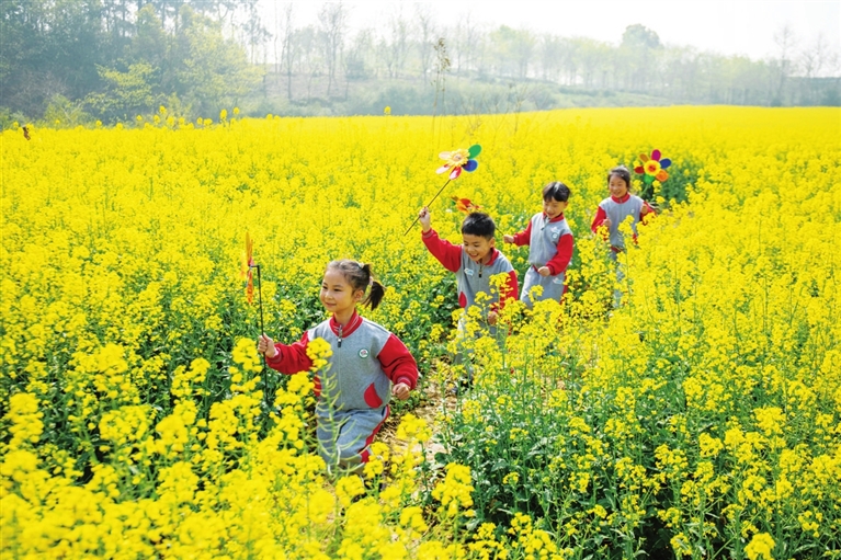 4月1日,浙江省湖州市长兴县泗安镇长岗岭村,小朋友在花田中奔跑。春光明媚,百花绽放,人们纷纷来到户外,感受春暖花开的美好。新华社发(谭云俸 摄)