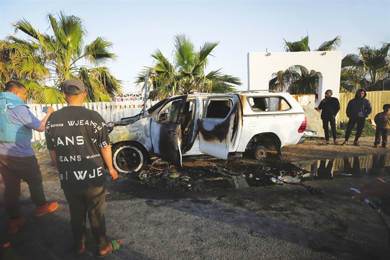 4月2日,在加沙地带中部代尔拜拉赫,巴勒斯坦人空袭过后查看被毁的汽车。新华社发