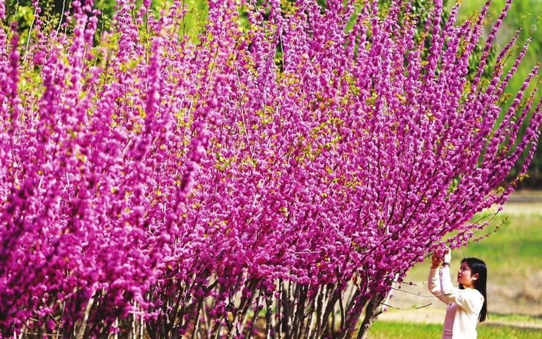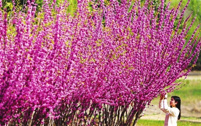 4月6日,游客在山东省滕州市上善公园赏花拍照。清明假期,各地繁花似锦、春意盎然,人们踏青游玩,乐享美好春光。新华社发(李志军 摄)