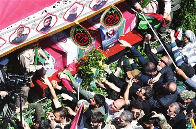 4月5日,在伊朗德黑兰,人们参加伊朗驻叙使馆遭袭事件中丧生的7名伊朗伊斯兰革命卫队成员的葬礼。新华社记者 沙达提 摄
