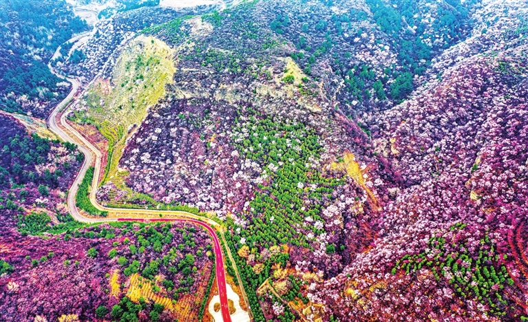 4月8日,俯瞰万柏林区桃花沟风景区,漫山桃花迎风绽放,美景如画。 王韵菲 摄