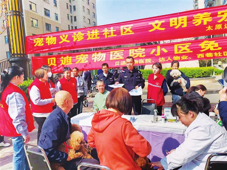 为进一步提升辖区居民文明养犬意识,4月8日上午,和平北路派出所践行“四方融合”服务管理模式,社区民警组织并邀请网格员、物业人员、宠物医院工作人员,在熙馨苑小区开展以“宠物义诊进社区 文明养宠伴我行”为主题的文明养犬宣传活动。活动现场,民警宣传《太原市养犬管理条例》,倡导及时给犬只上户办证,居民文明养犬;宠物医院工作人员提供免费义检、义诊服务。