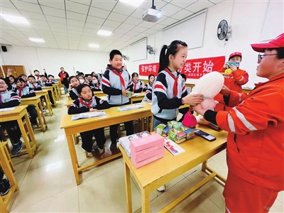 “矿泉水瓶是可回收垃圾、烂菜叶是厨余垃圾、用脏的面巾纸属其他垃圾……”活动中还设置有奖知识问答环节,孩子们兴致高涨,踊跃参与。社区工作人员表示,此次垃圾分类进校园活动,进一步增强了学生的垃圾分类意识,提高了垃圾分类的知晓率与参与率,以“个人带家庭,以小家带大家”,引导更多人成为垃圾分类的宣传者、践行者与监督者。(郭晓华、张 莹 文/摄)