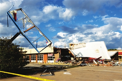 4月10日,在美国休斯敦附近的凯蒂,一座购物中心遭龙卷风袭击后受损。龙卷风等恶劣天气10日袭击美国南部地区,造成至少一人死亡、多人受伤,逾百座房屋受损。