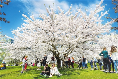 4月10日,人们在拉脱维亚维尔纽斯的樱花公园欣赏盛开的樱花。新华社/美联