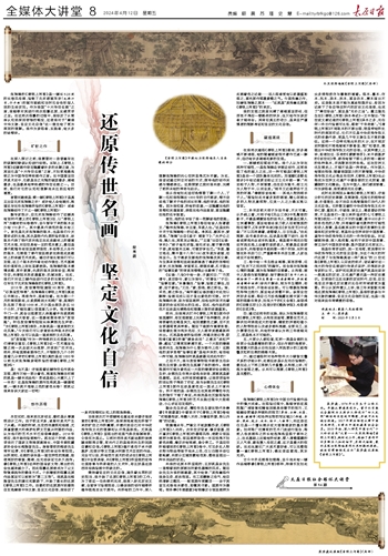 张择端的《清明上河图》是一幅长5.28米的长卷风俗画,绘制了北宋都城东京(也称汴京,今开封)的城市面貌和当时社会各阶层人民的生活状况。作为我国“十大传世名画”之首,我能够对其进行两次临摹还原,实感荣幸之至。在这两次临摹的过程中,我经历了从简单认知到深刻领悟的蜕变,这使我对于“赓续中华文脉、坚定文化自信”这一理念有了更为深刻的理解。我作为亲临者、实践者,有太多的话想讲。