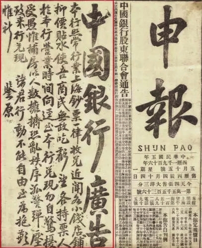 在这关键时刻,中国银行上海分行率先抵制“停兑令”,登报通告(见左图)延长营业时间收兑钞票。中国银行山西分行积极响应,准备充足白银,为客户一一兑付。到1916年5月19日,挤兑风潮完全平息。