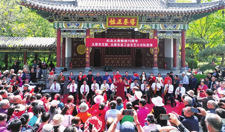 4月24日,由市文联、市总工会主办,市曲艺家协会承办的纪念太原解放75周年文艺小分队巡演活动在迎泽公园拉开序幕。小分队将走进学校、社区和省军休所等地开展系列文艺演出。张昊宇 摄