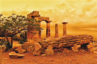 这是4月23日在希腊科林斯拍摄的被沙尘笼罩的阿波罗神庙。