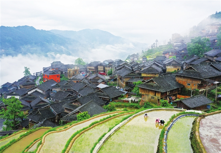 4月27日,村民在贵州省黔东南苗族侗族自治州从江县加榜乡加车村梯田里移栽水稻秧苗(无人机照片)。