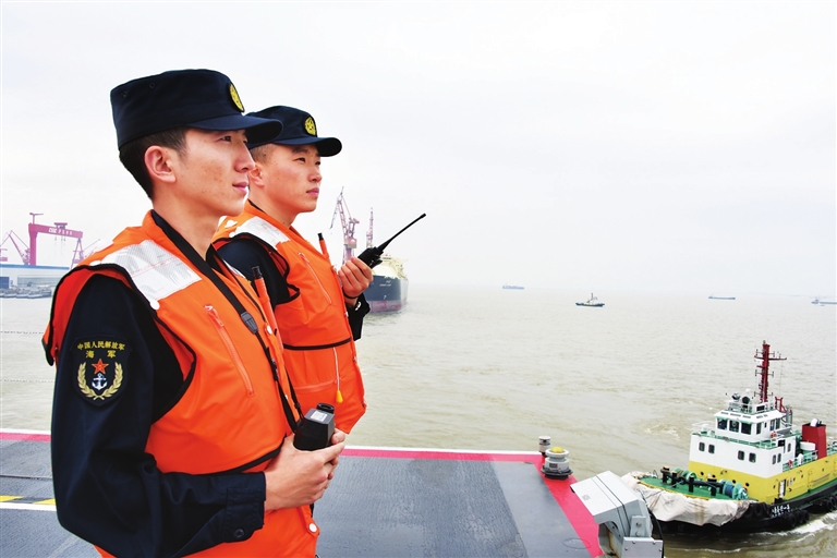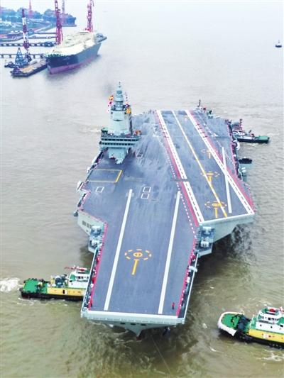 图③ 拖船正在将福建舰拖离码头。新华社记者 黎 云 摄