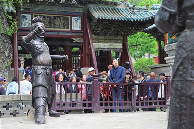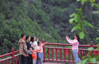 停车场一位难求,入口处排起长龙,“五一”假期,风景秀丽的天龙山景区内游人熙熙攘攘。蟠龙松、七松坪、国宝馆、漫山阁……到处都是结伴而行的游客。