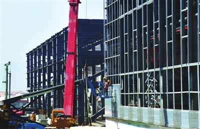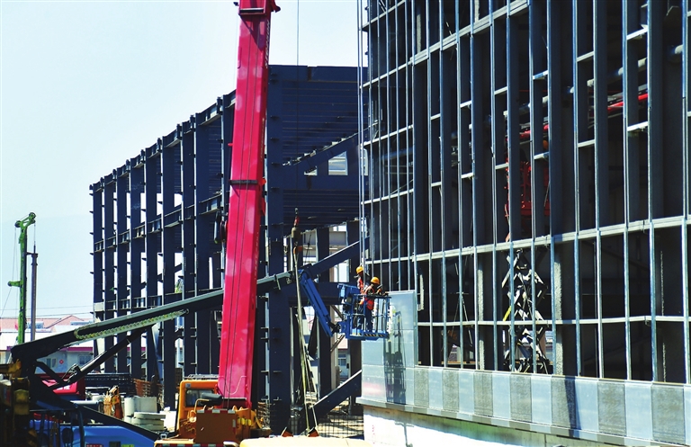 5月13日,太原高性能制造技术与智能应用升级中试基地建设项目工地,中铁十二局集团的建设者正在给钢结构厂房安装外围护。目前,该项目建设进入全面提速阶段,两座标准化厂房已收尾,传感器厂房、配套楼已封顶,总体工程量完成40%以上。赵世凯 屈丽霞 摄影报道