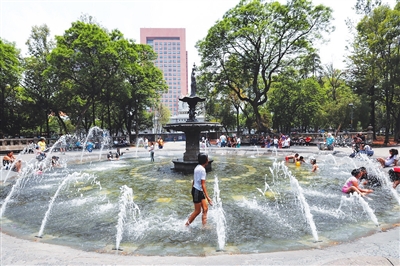 5月12日,人们在墨西哥首都墨西哥城的喷泉中玩耍。墨西哥南部、中部和北部地区的降雨将让近十天肆虐墨西哥的热浪有所缓解。但根据墨西哥国家气象局的数据,该国仍然有14个州的气温将持续超过40摄氏度。新华社/欧新