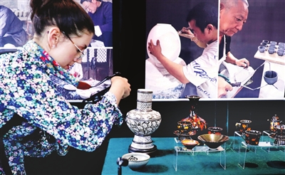 5月13日,一名观众在英国伦敦手工艺周“设计中国·和韵华夏”主题展上拍摄。2024年伦敦手工艺周5月13日在伦敦拉开帷幕,数百场展览、工作坊、论坛等活动遍布全城。来自中国的传统技艺与创新工艺为活动增添了一抹亮色。