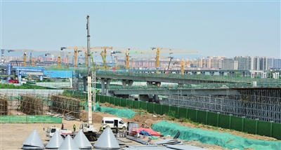 5月14日,太原武宿国际机场三期改扩建高架桥工程建设现场,桥梁已初具规模。该工程建成后,将串联T2航站楼、T3航站楼、综合交通中心,进一步改善机场交通。牛利敏 摄