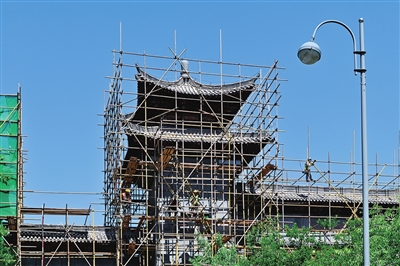 5月18日,市城管局市政建管中心施工人员在蒙山景区山门搭建脚手架。太原蒙山区域生态治理工程日前拉开序幕,本次建设内容包含土建工程、生态工程及亮化工程。工程完工后,蒙山生态系统将提档升级,更利于消除地质灾害隐患及防火安全隐患,进一步提升服务品质和游客体验满意度。梁 琛 摄