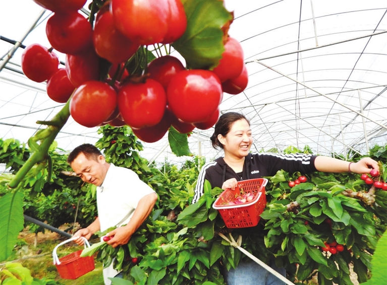 5月20日,四川省达州市通川区金石镇金山村秋实种植专业合作社智能大棚内,村民在采摘车厘子。近年来,四川省达州市积极探索丘陵山区数字乡村发展路径和方法,乡村数字化应用场景持续涌现,有力促进了农业生产和农民增收,助力乡村振兴。新华社发(邓良奎 摄)