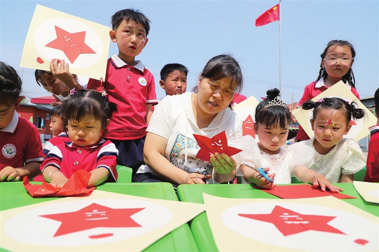 5月24日,小店区北格镇南代家堡幼儿园开展“中华文化我传承”迎“六一”主题活动,邀请国家级非物质文化遗产太原剪纸传承人任清香现场教授剪纸。张昊宇 摄