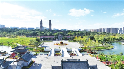 到了立夏,太原人没穿几天的春装,就该换夏装了。太原的夏天从5月份到9月份。夏天寻访太原的物候物象,我最喜欢去双塔公园,即永祚寺。“凌霄双塔”是“古晋阳八景”之一,为明代建筑。整个永祚寺里绿树红墙,宝塔梵殿,碑碣栉比,花卉斗艳,松柏凝翠。我之所以愿去双塔寺追寻季节的变化,是因为寺内满院溢香的牡丹和布满长廊的历代名家碑刻。国色天香的牡丹,在华北平原一般开在明媚的春天,而黄土高原太原盆地的牡丹,则往往开在每年的初夏时节。几年前夏天的一个傍晚,我和几位同事到永祚寺寻幽。夕阳的余晖洒在园里,牡丹将谢未谢。我们看过前院的牡丹后,又到后院寻访明代栽植的牡丹紫霞仙。进门之时,看到古文字学家张晗的一副楹联。因为先生是用篆体书丹,诸位似曾相识,但又不能一下子通读,只能共同学识释读。这副楹联的内容是:“风藻无穷,帖爱宝贤花爱紫;因缘有会,寺求永祚塔求双。”永祚寺的夏天,从牡丹盛开,一直到重阳节之前的菊展结束。永祚寺地处市区东南郝庄村的南山冈上,居高临下,可俯瞰整座太原城,正因为如此,解放太原时,这里曾是攻守双方激烈争夺的据点。在国泰民安、物阜年丰的时代,夏日的永祚寺,既可寻幽避暑,亦可登高赏月,是一处百去不厌的地方。
