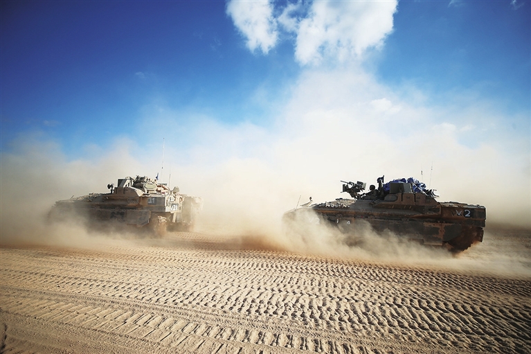 这是五月二十九日在以色列与加沙边境以方一侧拍摄的以军部队。以色列军方发言人哈加里二十九日晚发表声明说,以军对加沙地带与埃及边界的“费城走廊”实现“完全作战控制”。新华社发