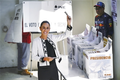 6月2日,在墨西哥首都墨西哥城一处投票站,墨西哥执政党国家复兴运动党所在竞选联盟总统候选人克劳迪娅·辛鲍姆准备投票。新华社记者 李木子 摄