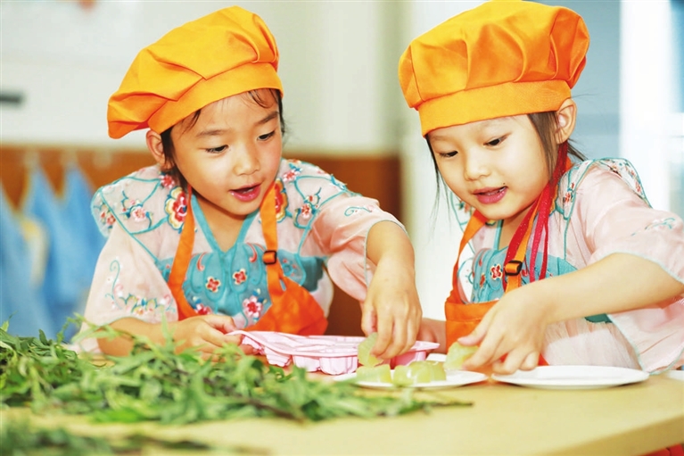 6月4日,四川省广安市武胜县沿口第三幼儿园的小朋友在制作艾叶皂。端午佳节将至,各地举办丰富多彩的活动迎接这一传统节日。新华社发