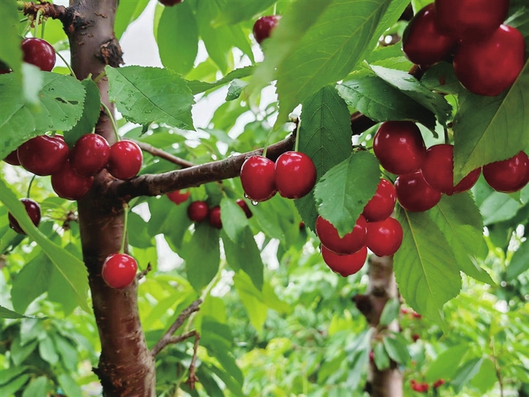 约2米高的樱桃树上,一串串红色的大樱桃宛如害羞的少女,掩映于绿叶中。风吹叶动,露出圆润鲜亮的樱桃。咬一口脆甜多汁,齿颊留香。