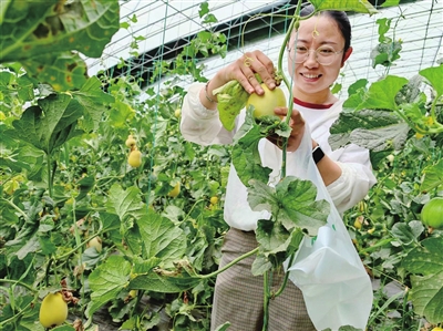 “这种黄色、沙甜的甜瓜叫‘心甜’,一只手能握住的小西瓜叫‘红墩墩’,是不是很可爱?”工作人员何燕介绍。今年,园区里种了2亩小西瓜和3亩甜瓜,本月还有不少可以采摘。